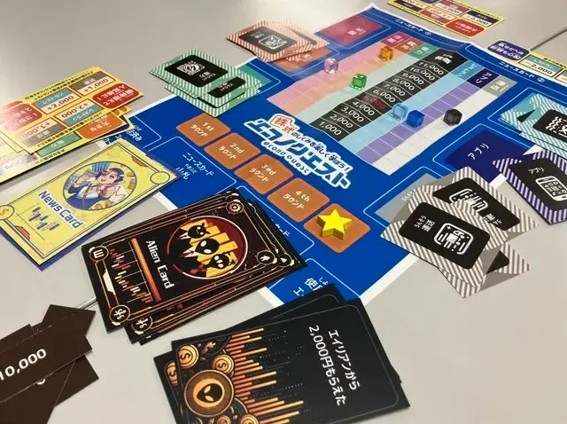 プレイヤーは5ラウンドを通して、6社の株式を売買します。現金を最も増やせた人の勝利です。ニュースを見ながら株価の上下を予想しましょう!エイリアンが登場!?大株主になると、裏からゲーム操作ができるかもしれません!